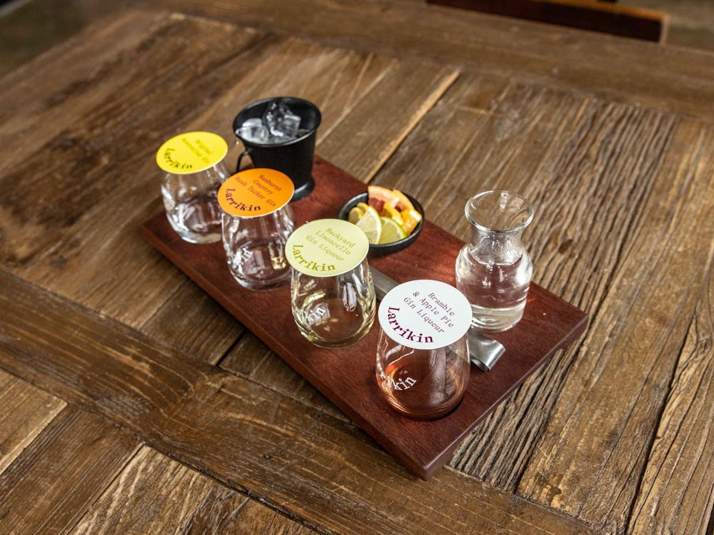 Delight your tastebuds with a Larrikin Gin Flight, comprising your choice of four 15 millilitre pours from their gin and gin liqueur range, accompanied by tonic or soda and a range of citrus fruit.